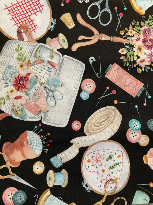 Sewing thread bobbins Fabric Benartex Kanvas Fancy Threads Sew in Love Black Background Priced by the Half Yard Cut continuously