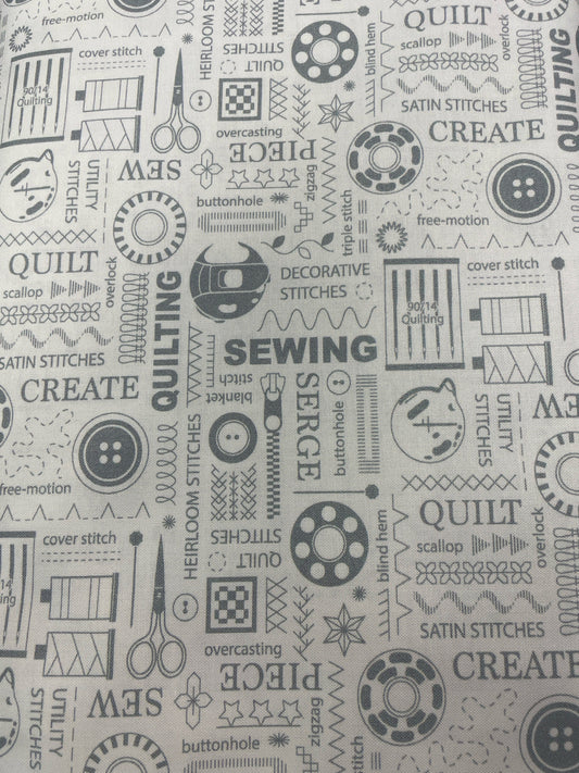 Sewing Words Sewing Room Fabric Benartex Stitches Cloud Light Gray on white Background Priced by the Half Yard Cut continuously