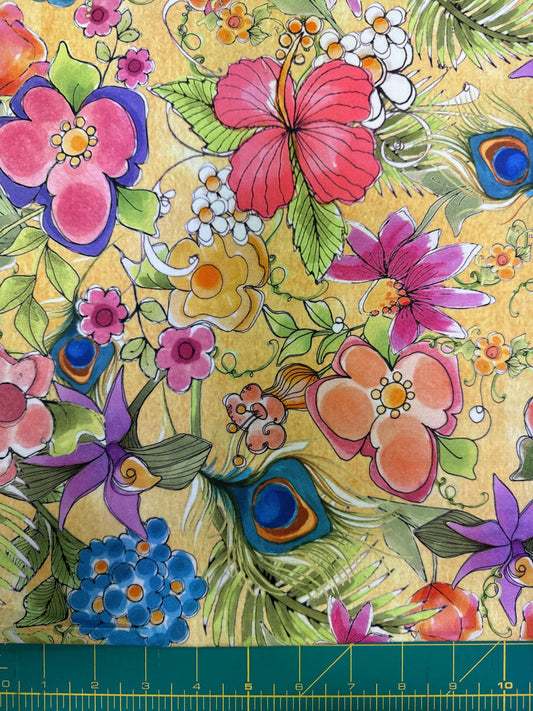 Flamingo Floral Loralie bright flowers and Peacock Feathers on Yellow Priced by the Half yard cut continuously New