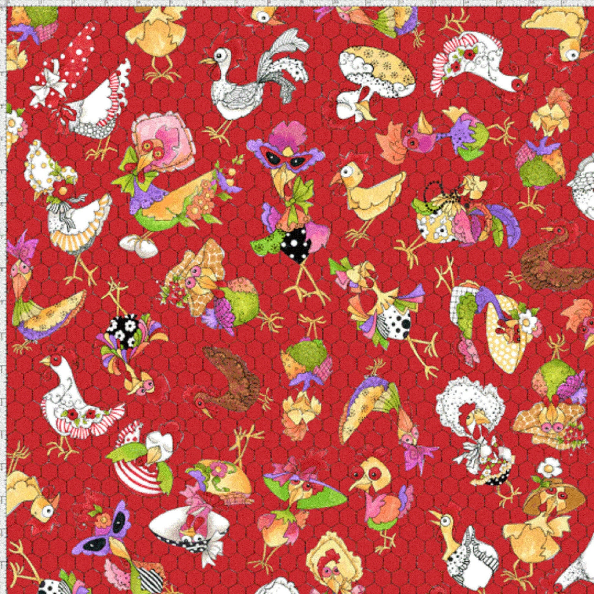 Loralie Coopers Chicken Chique Fabric on Red Background Fabric Loralie Harris - Priced by the 1/2 Yard - Cut in 1 piece