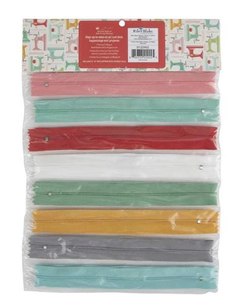 The Happy Zippers by Lori Holt of Bee in my Bonnet come in a package of 8 different zippers in Lori's fun colors. Each zipper is 1" x 16" and has 2 zipper pulls. The Happy Zippers have polyester fabric tape, zinc alloy sliders and pulls, and nylon teeth.