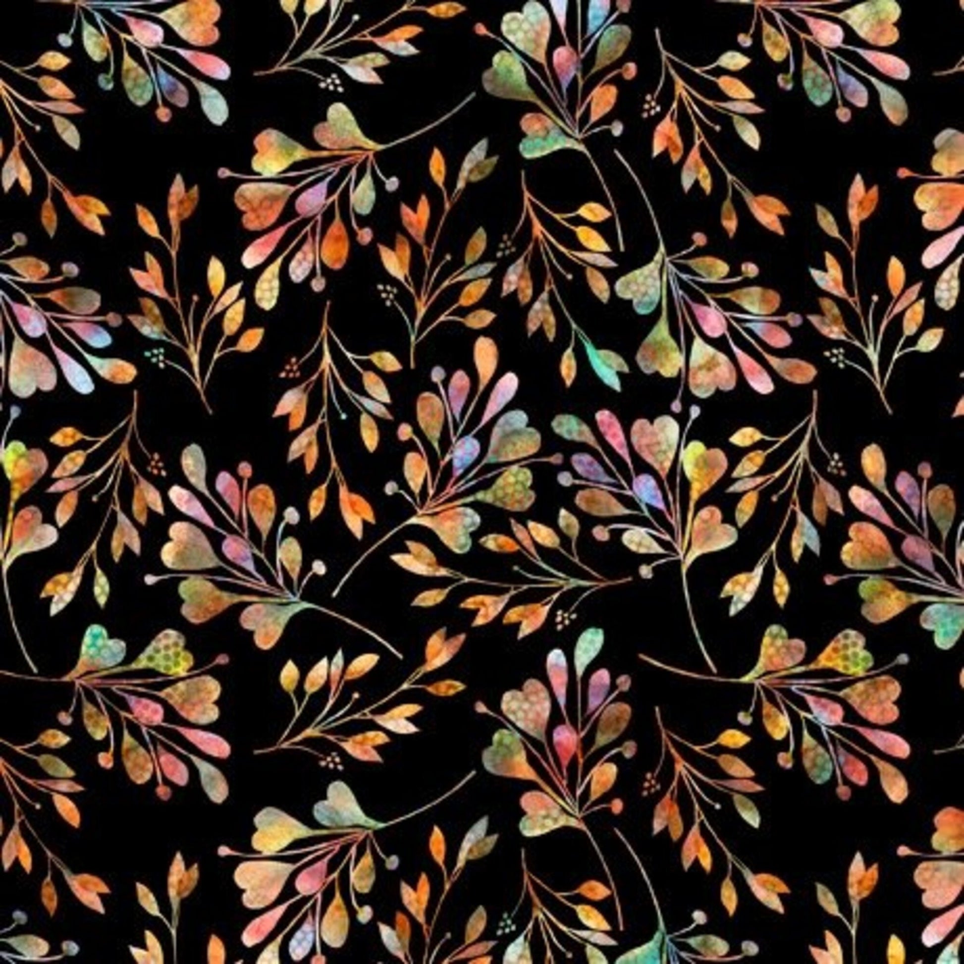 Periwinkle Floral Leaves on Black QT fabric 28630 J Price by the Half Yard