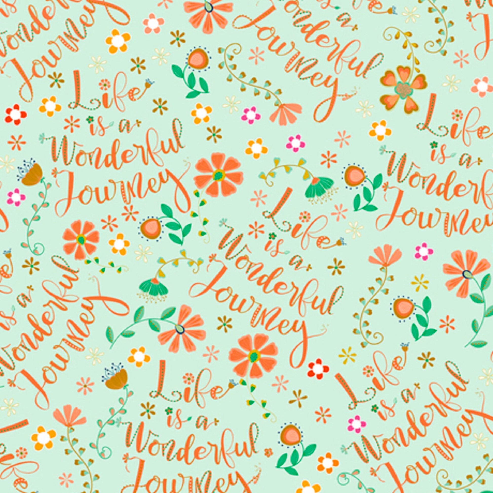 Road Trip Flower Power Life is a Wonderful Journey Words Fabric - QT Fabrics Aqua Background - Priced by the 1/2 yard - NEW